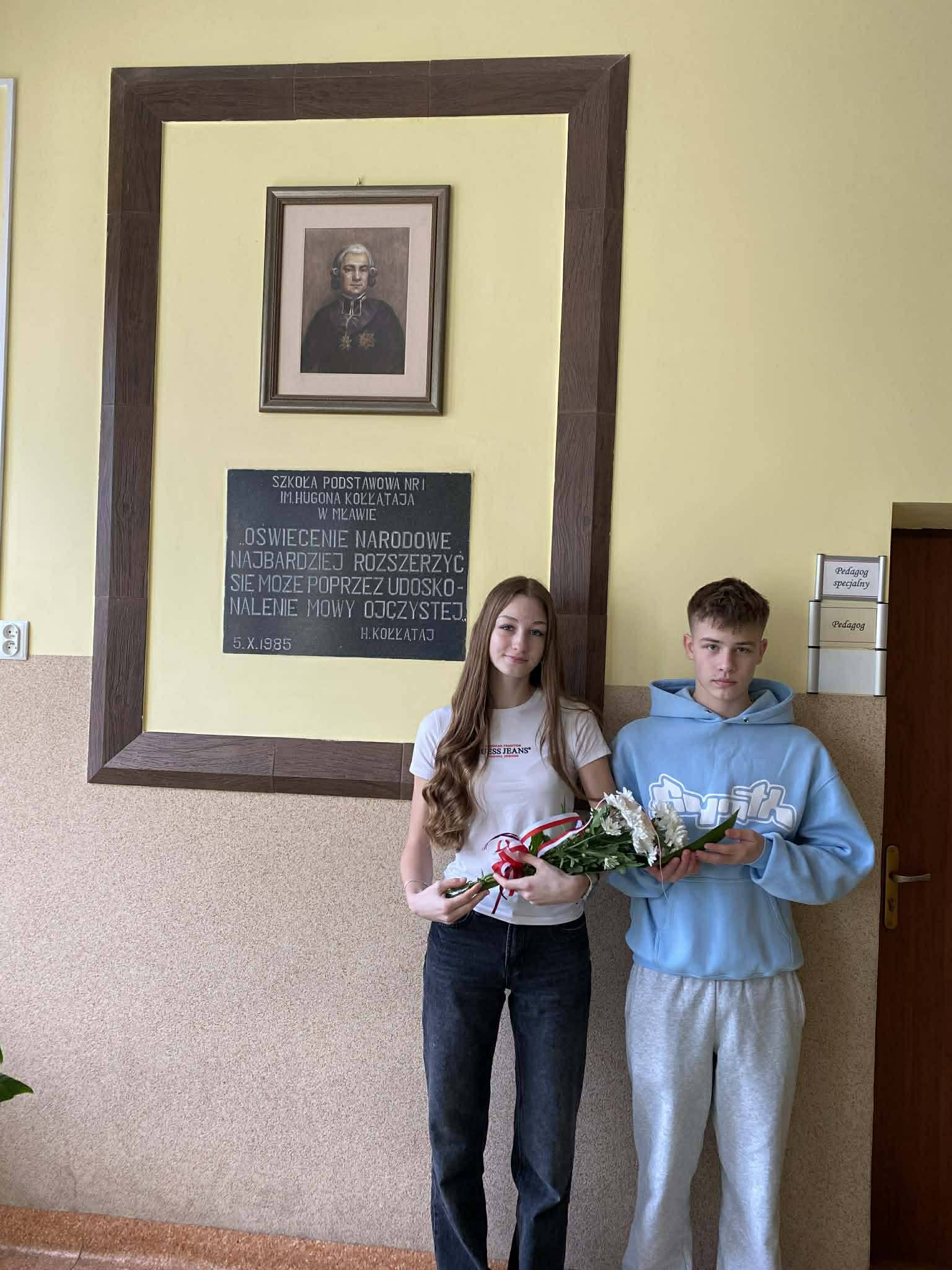 Samorząd Uczniowski pamięta o patronie szkoły. Z okazji 214 rocznicy śmierci Hugona Kołłątaja przedstawiciele Samorządu Uczniowskiego złożyli kwiaty pod tablicą patrona.