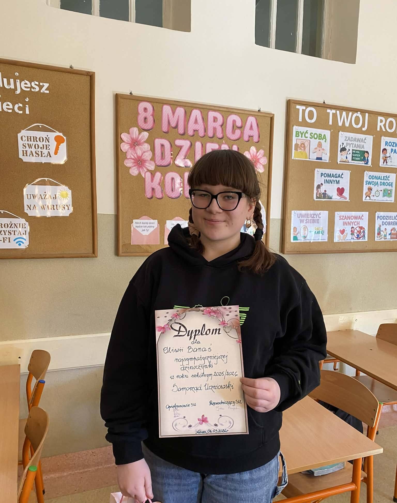 Z okazji Dnia Kobiet Samorząd Uczniowski zorganizował konkurs na najsympatyczniejszą dziewczynkę w szkole. Uczniowie mogli oddawać głosy na swoje koleżanki, doceniając ich życzliwość, uśmiech i