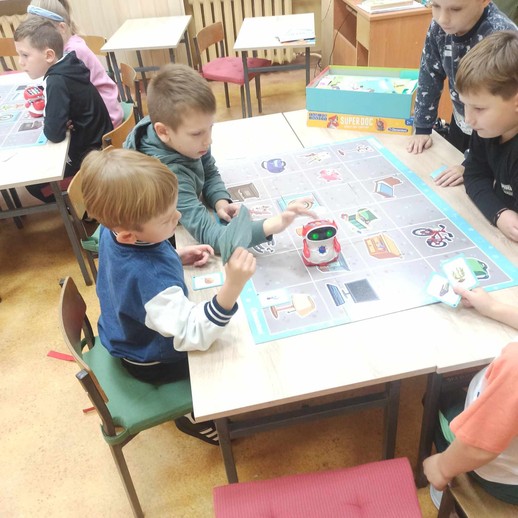Uczniowie klasy 1b na zajęciach dodatkowych z wielkim zaangażowaniem uczyły się kodować z robocikiem DOC.