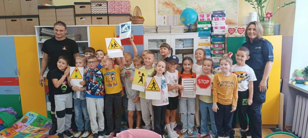 12 września uczniowie klas pierwszych spotkali się z policjantką, która przypomniała dzieciom o bezpiecznym zachowaniu nie tylko na drodze i wręczyła odblaski. W zajęciach uczestniczył też strażak i uczył dzieci zachowania w sytuacjach zagrożenia zdrowia lub życia. Pierwszaki uczyły się udzielać pierwszej pomocy przedmedycznej, zapoznały się z użyciem defibrylatora. Bardzo dziękujemy naszym miłym gościom za spotkanie.