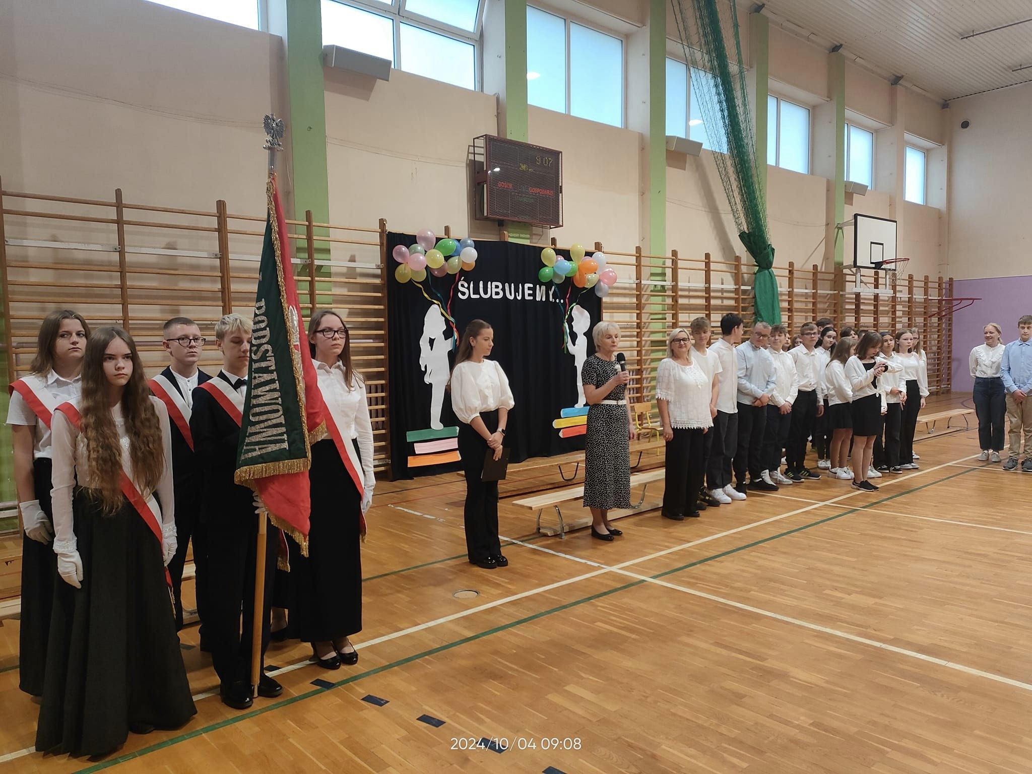 4 X 2024r. na uroczystym apelu szkolnym uczniowie klas pierwszych złożyli obietnicę, że będą wzorowymi uczniami naszej szkoły i obywatelami Rzeczypospolitej Polskiej. Przyrzeczenie zostało złożone