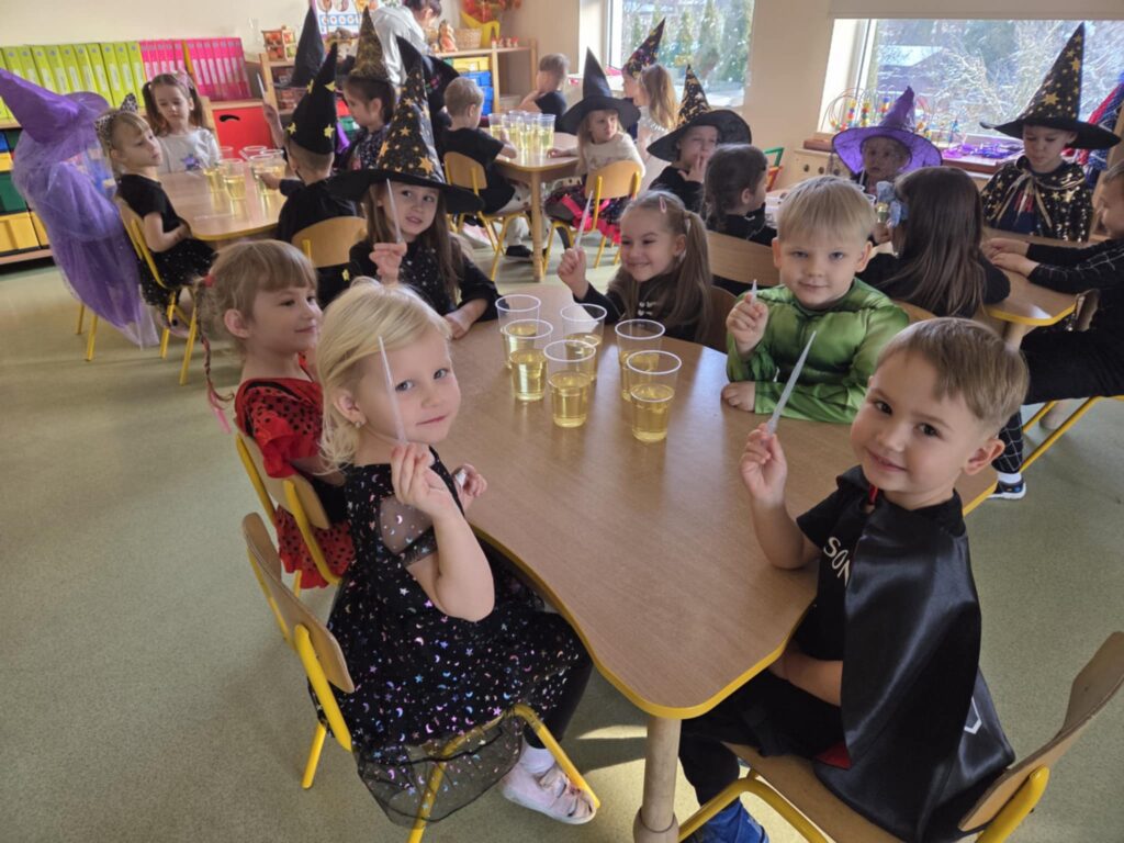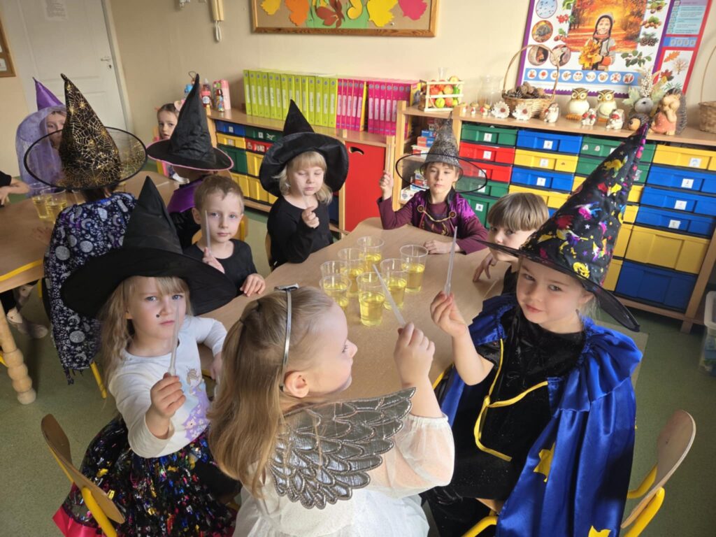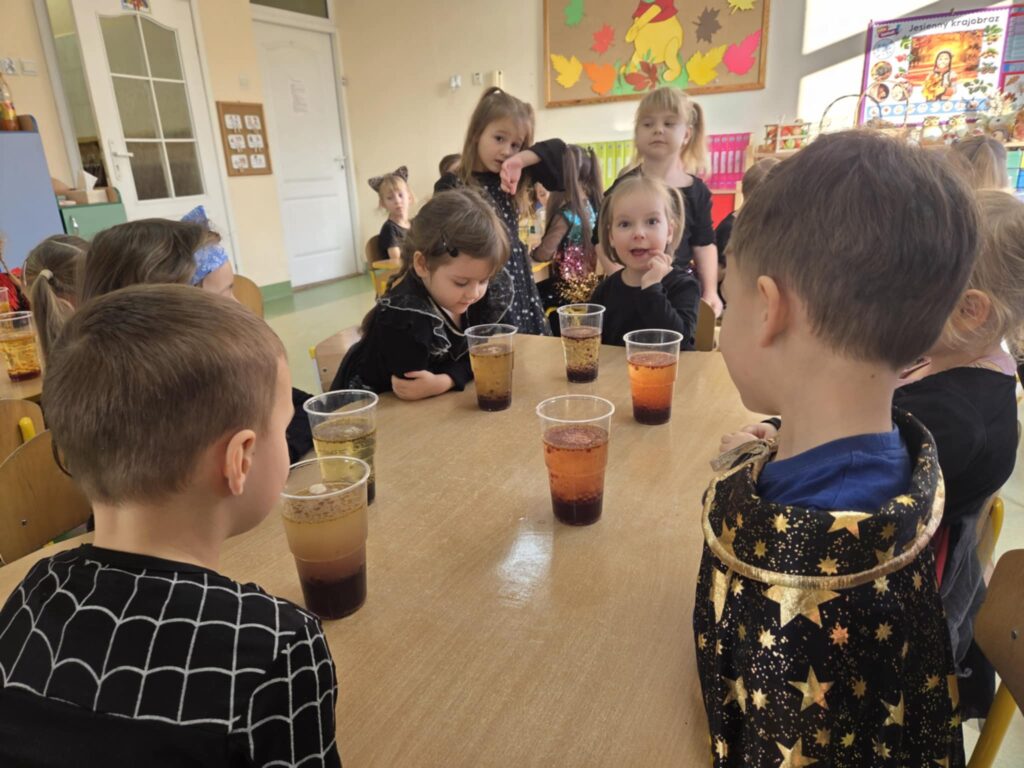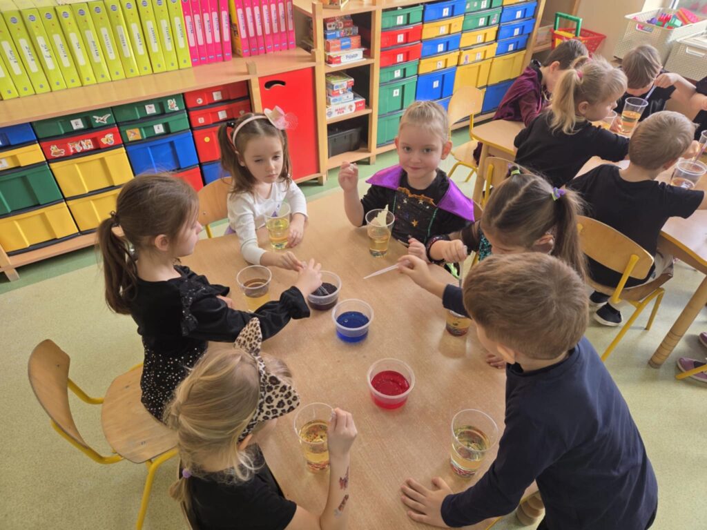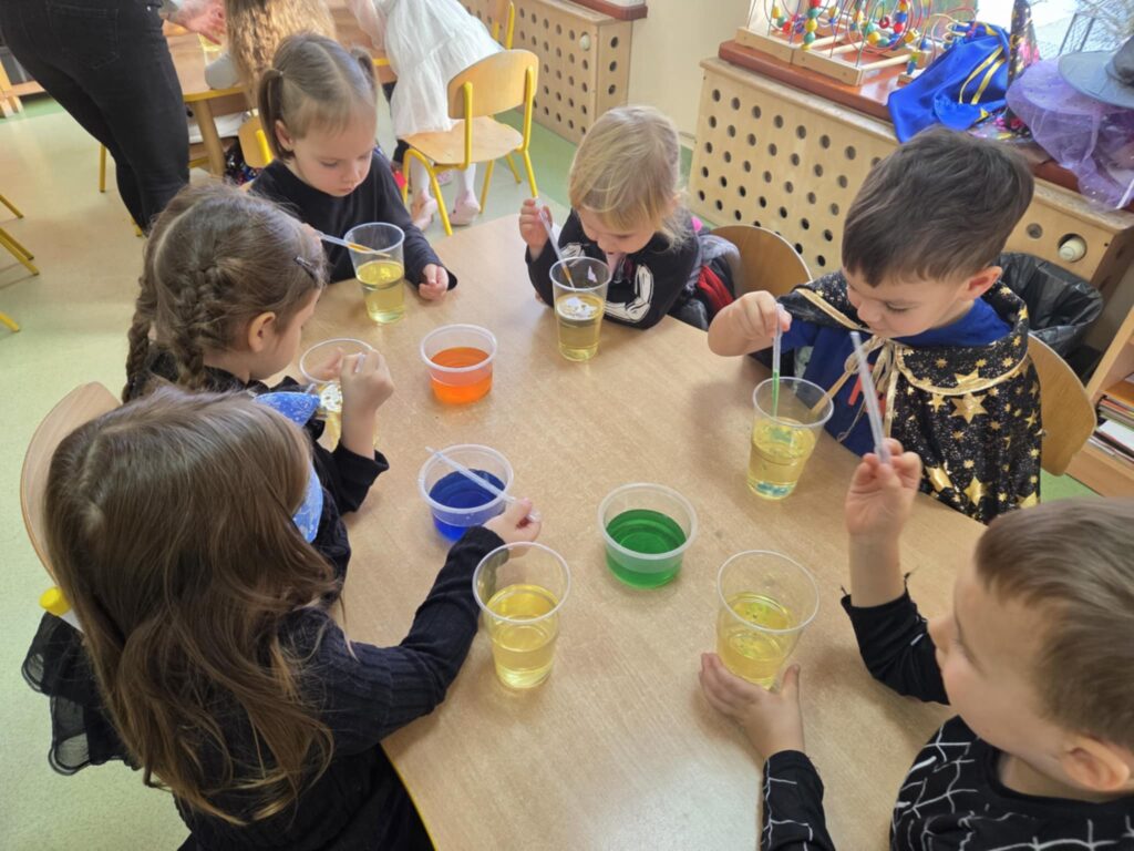 W grupie „Orzeszki” dzieci przeprowadziły ciekawy eksperyment związany z przygotowaniem andrzejkowego magicznego eliksiru. Do doświadczenia użyły oleju, zabarwionej wody oraz tabletki musującej. Przedszkolaki za pomocą zakraplacza dodawały kolorową wodę do oleju, a na końcu wrzuciły tabletkę musującą. Obserwowały, że woda i olej nie mieszają się ze sobą, a dodanie tabletki spowodowało unoszenie się zabarwionej wody, co wyglądało jak magiczny efekt. Eksperyment wywołał uśmiech na twarzach dzieci i był dla nich fantastycznym doświadczeniem.