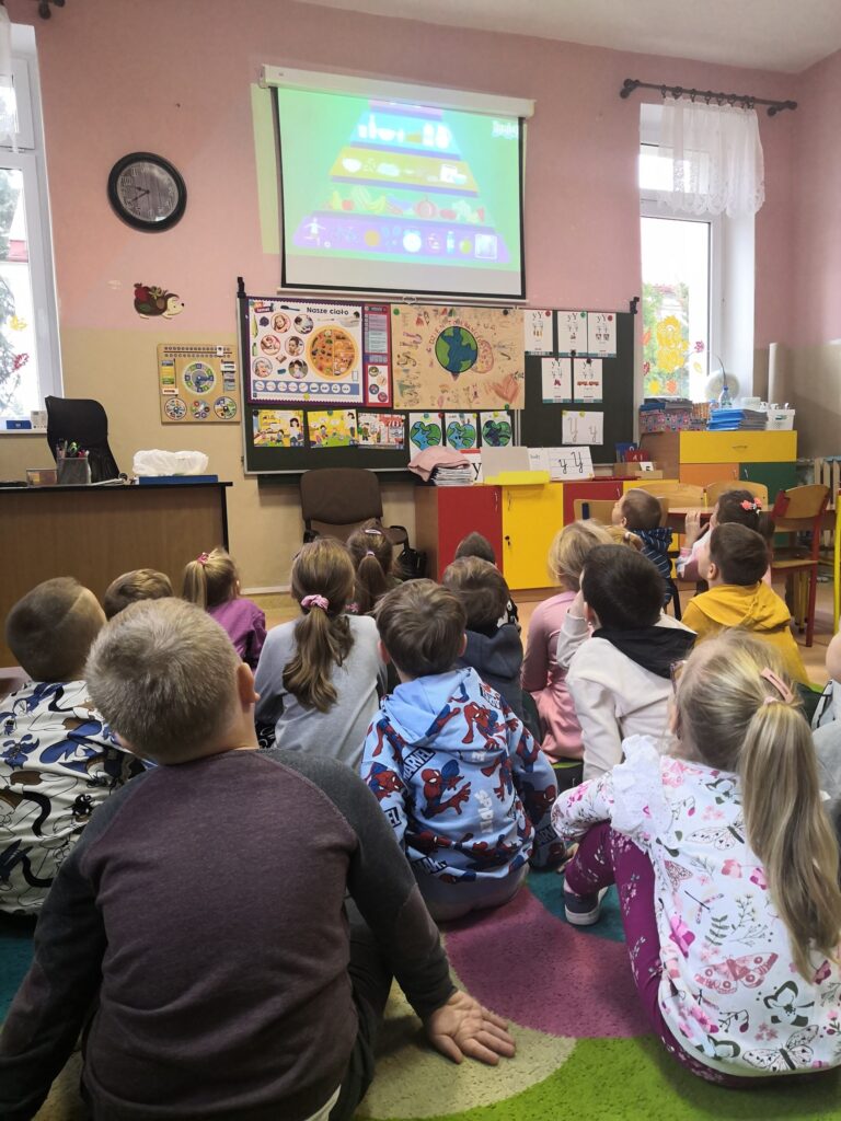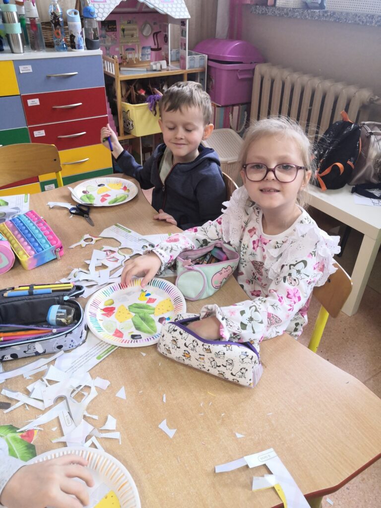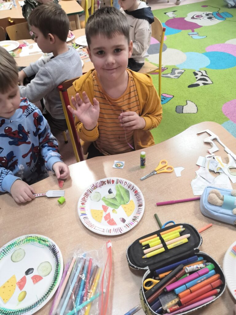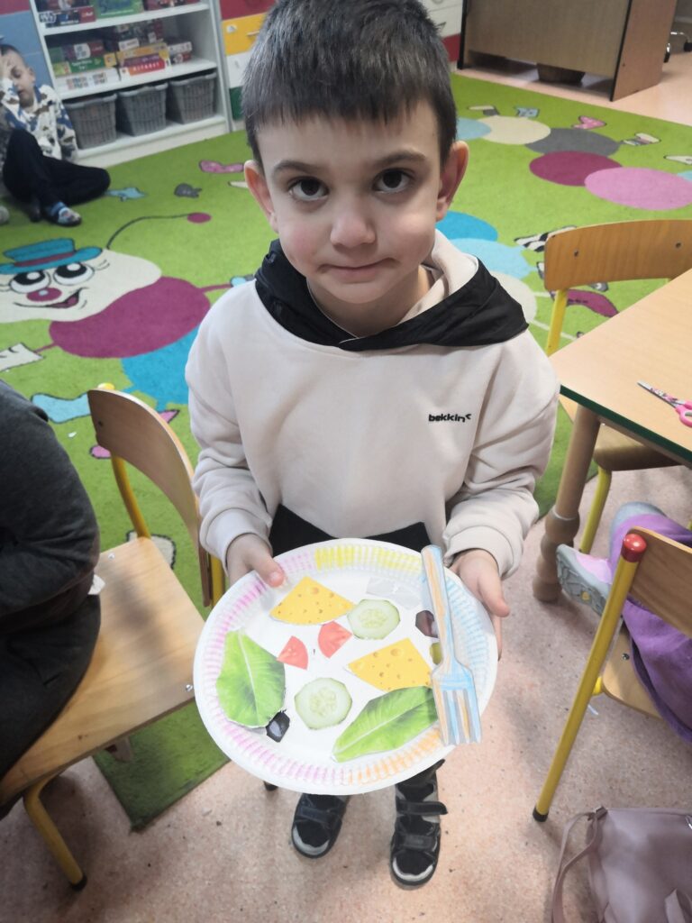 W ramach realizacji programu ,,Przedszkole promujące zdrowie” dzieci z grupy Orzeszki uczestniczyły w zajęciach rozwijających świadomość prozdrowotną. Przedszkolaki poznały zalecenia zdrowego żywienia, wypowiadały się na temat produktów, których należy jeść mniej, a których więcej. Dzieci uczestniczyły również w zabawie sensorycznej ,,Co to za zapachy?”. Następnie poznały przepis na pyszną i zdrową sałatkę. Przedszkolaki wykonały pracę plastyczno – techniczną ,,Zdrowa sałatka”. Najpierw ozdobiły papierowe talerzyki kolorowymi wzorkami, po czym wybrały właściwe składniki i skomponowały zdrową sałatkę.