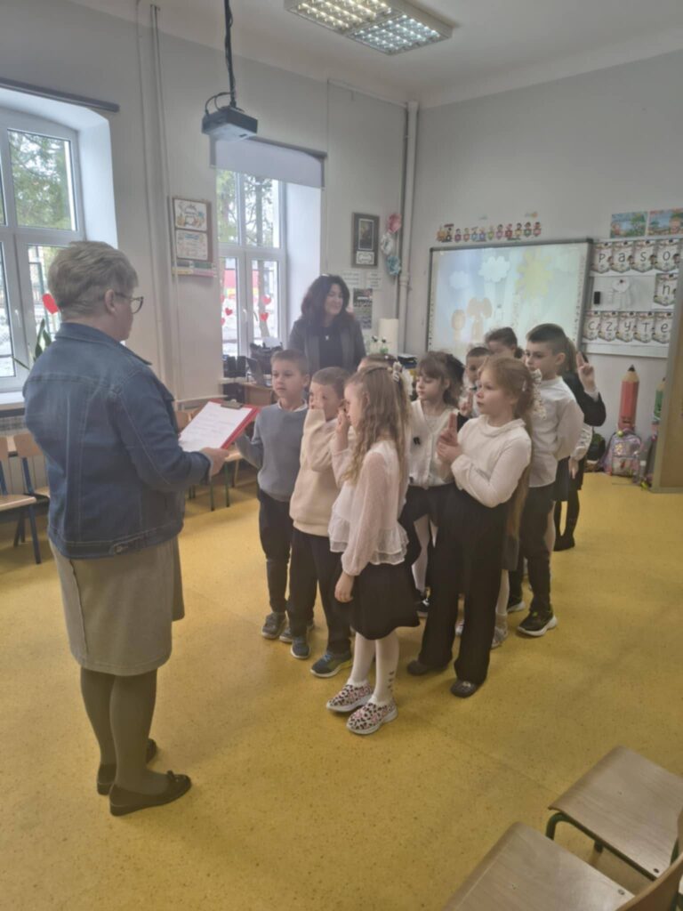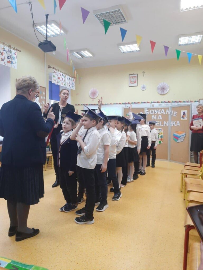 Po wspólnym odczytaniu wiersza – ” Wiem wszystko” uczniowie wykazali się dużą wiedzą, przeszli sprawdzian i wyśmienicie, poradzili sobie ze wszystkimi przygotowanymi zadaniami. W końcu nadszedł uroczysty moment przysięgi: „My uczniowie pierwszej klasy Tobie książko przyrzekamy, że szanować Cię będziemy, krzywdy zrobić Ci nie damy… Finalnie pasowania na „nowych czytelników” dokonała Pani dyrektor Janina Lampkowską. Dzieci otrzymały pamiątkowe zakładki i wypożyczyły piękne, kolorowe książki…