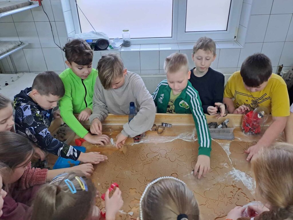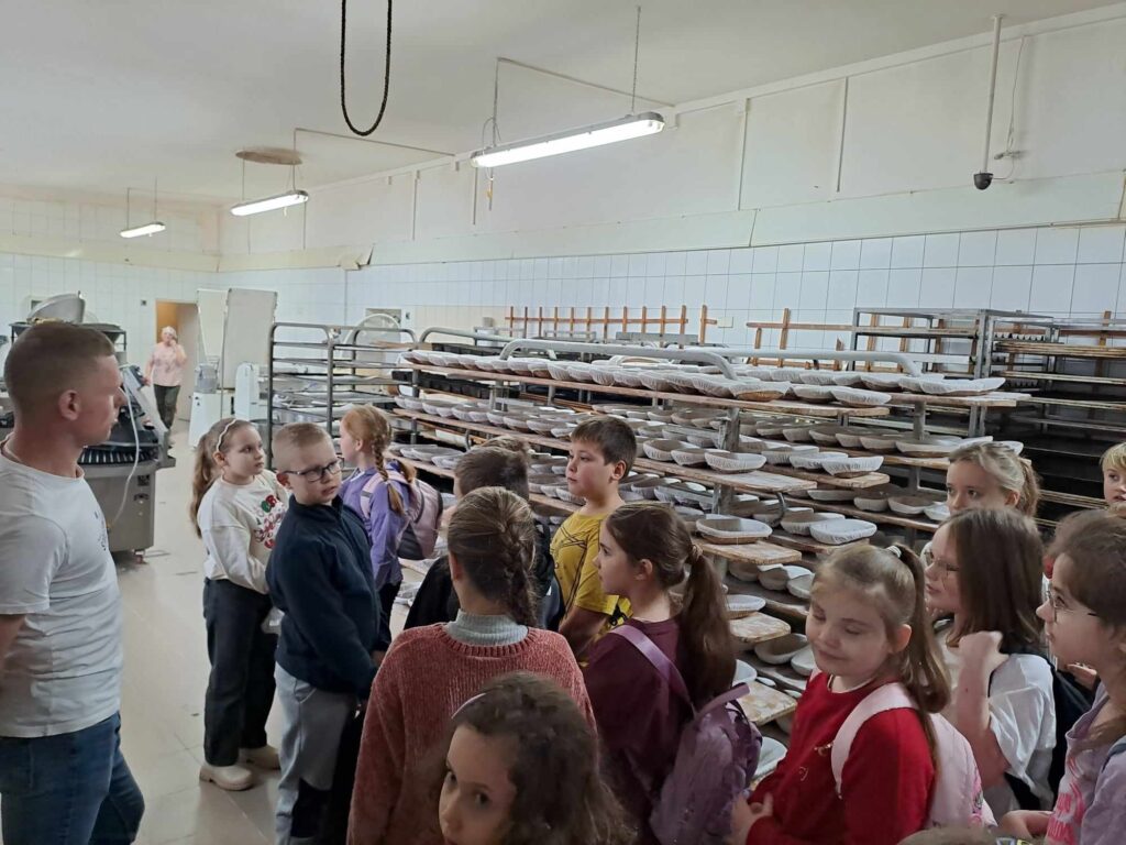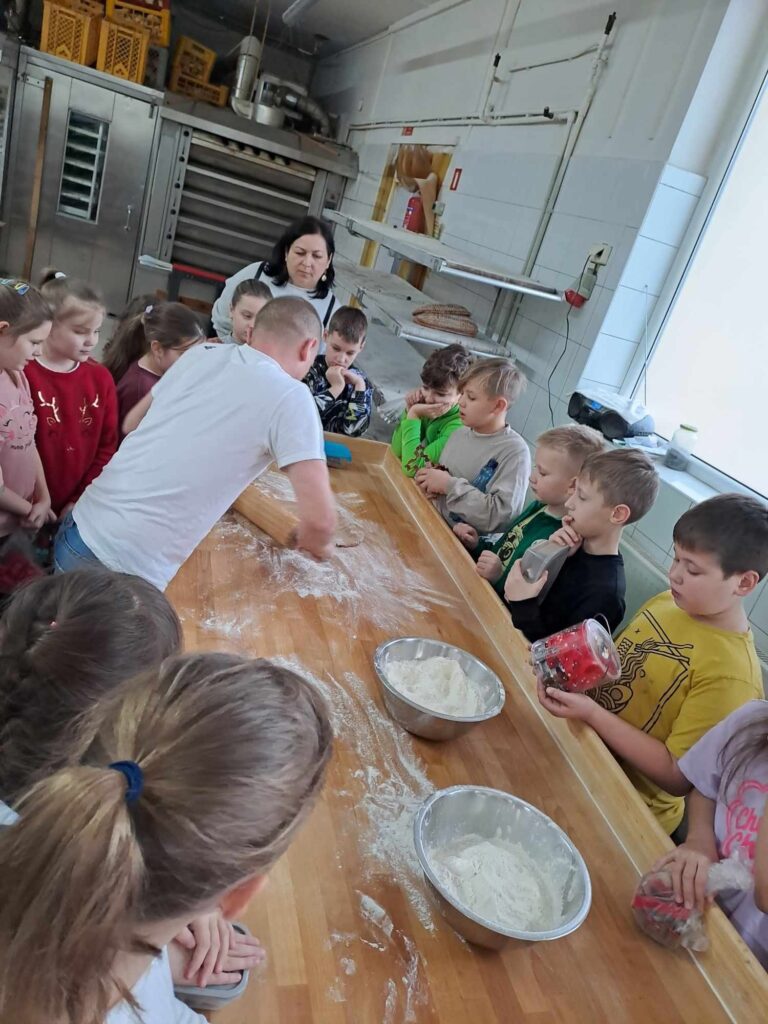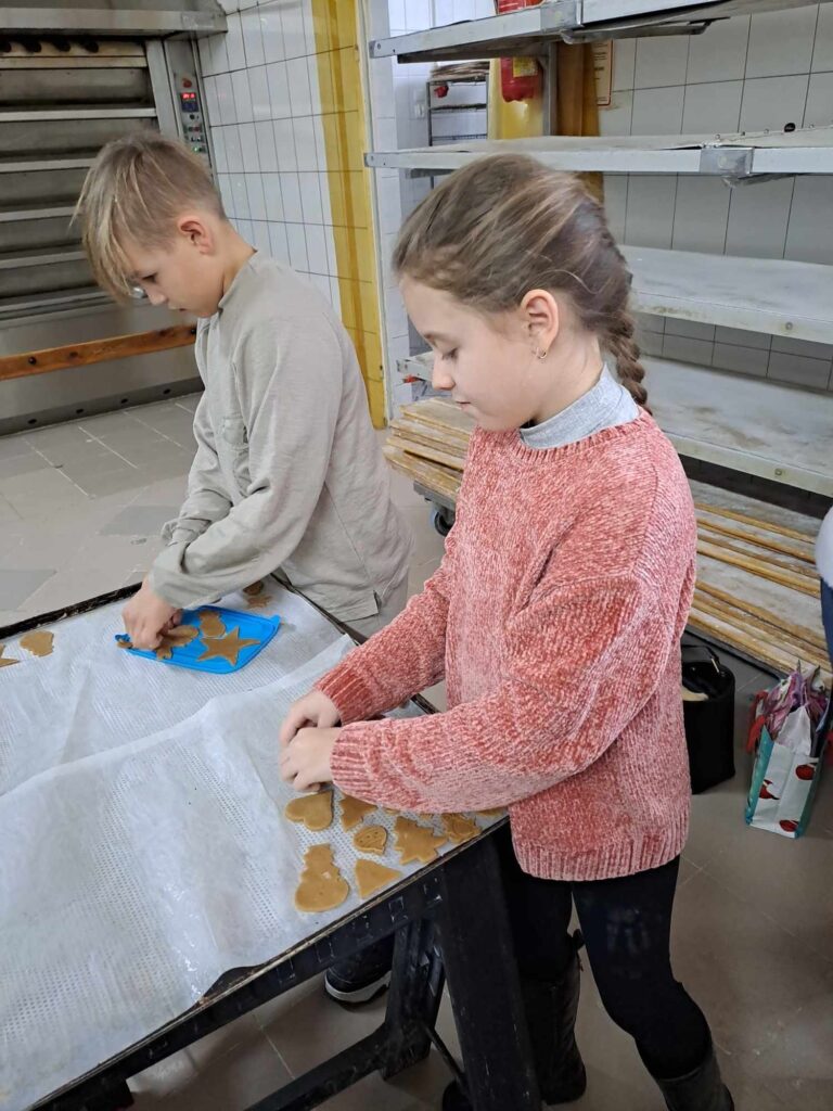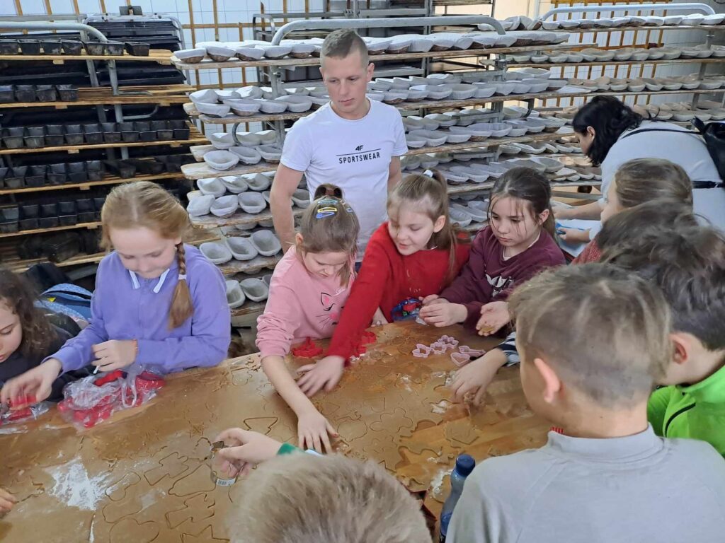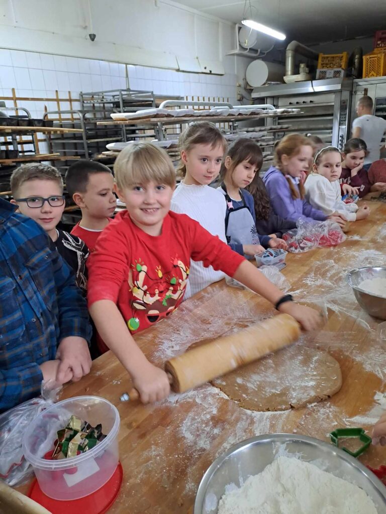 11 grudnia uczniowie klasy 3b skorzystali z zaproszenia rodziców Lenki i udali się na warsztaty pieczenia pierników. Tata Leny oprowadził uczniów po piekarni i opowiedział im o przeznaczeniu poszczególnych maszyn. Następnie dzieci zabrały się za przegotowanie pierników. Do zadań uczniów należało: rozwałkowanie wcześniej przygotowanego ciasta, kolejno wyciskanie za pomocą foremek różnych kształtów. Finalnie pierniki trafiły do profesjonalnego, dużego pieca. Pierniczki wyszły bardzo piękne i smaczne, dlatego znikały w zawrotnym tempie. Dodatkową atrakcją była możliwość uformowania własnej kajzerki. Podczas prac dzieci pamiętały o kilku ważnych zasadach małego kucharza – zasadzie bezpieczeństwa, higienie i czystości. Jeszcze raz dziękujemy rodzicom Lenki za zaproszenie.
