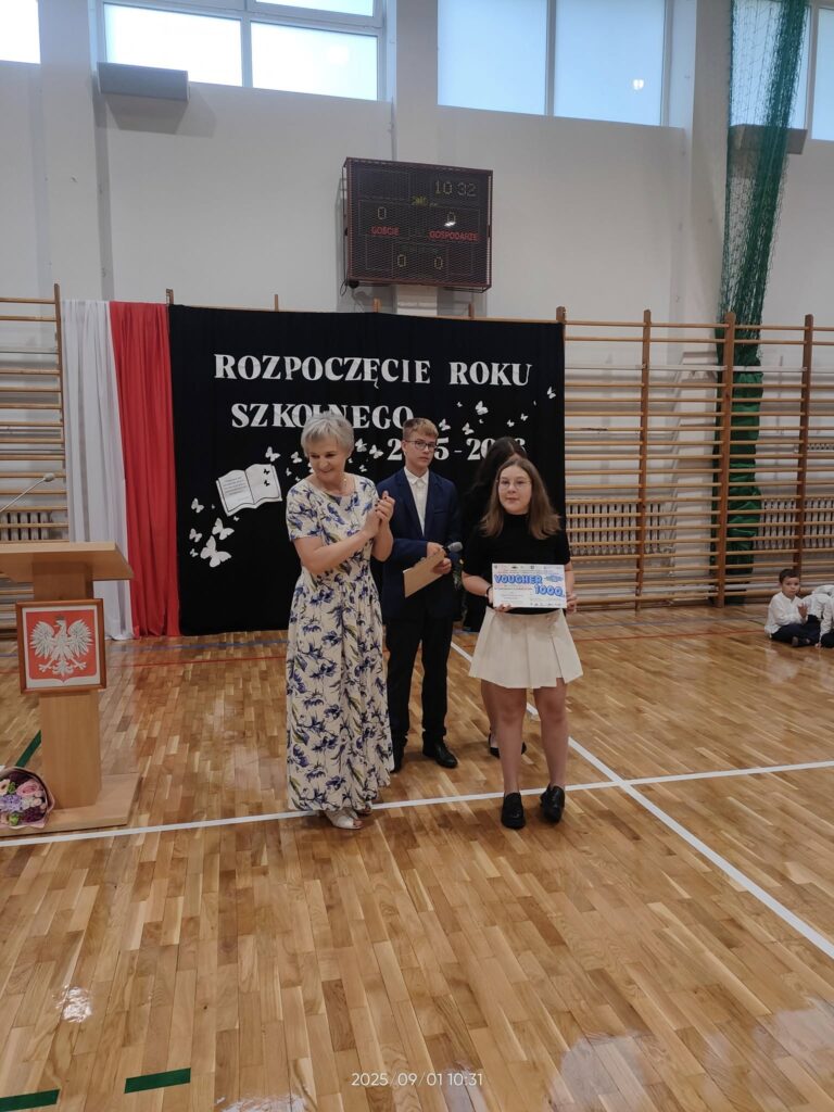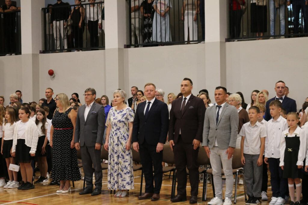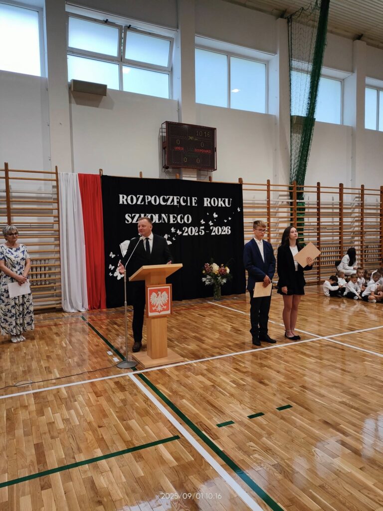Podczas dzisiejszej ceremonii spotkaliśmy się wspólnie na odnowionej sali gimnastycznej w towarzystwie gości z Urzędu Miasta burmistrza p.Piotra Jankowskiego, zastępcy burmistrza p.Mariusza Szczechowicza, radnego p. Pawła Łubińskiego oraz przewodniczącego RR Arkadiusza Leszczyńskiego.