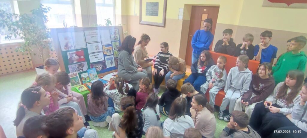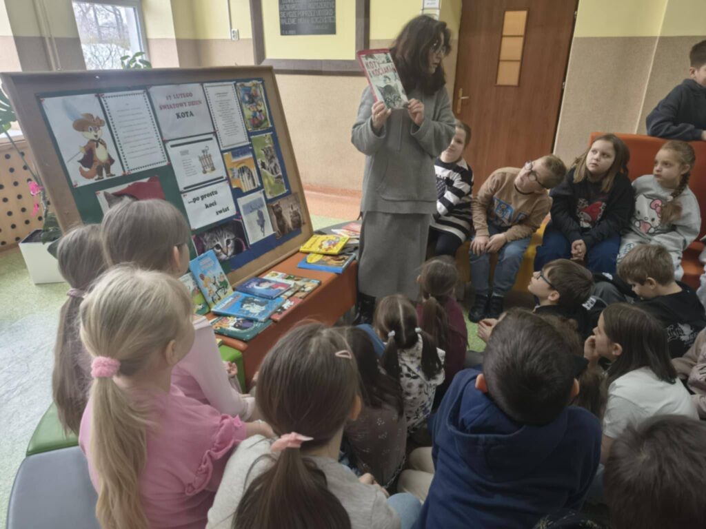 Wspólnie z uczniami klas 1 – 4 czytaliśmy ciekawostki oraz fragmenty książek o kotach. Największą popularnością cieszyły się zabawne książki z serii o kocie „Cukierku” oraz „Kocie historie”. Dzieci opowiadały również o swoich pupilach – o tym jak się zajmują swoimi „mruczkami”.