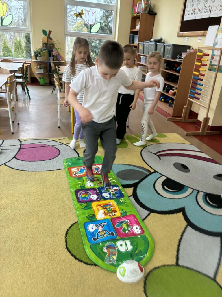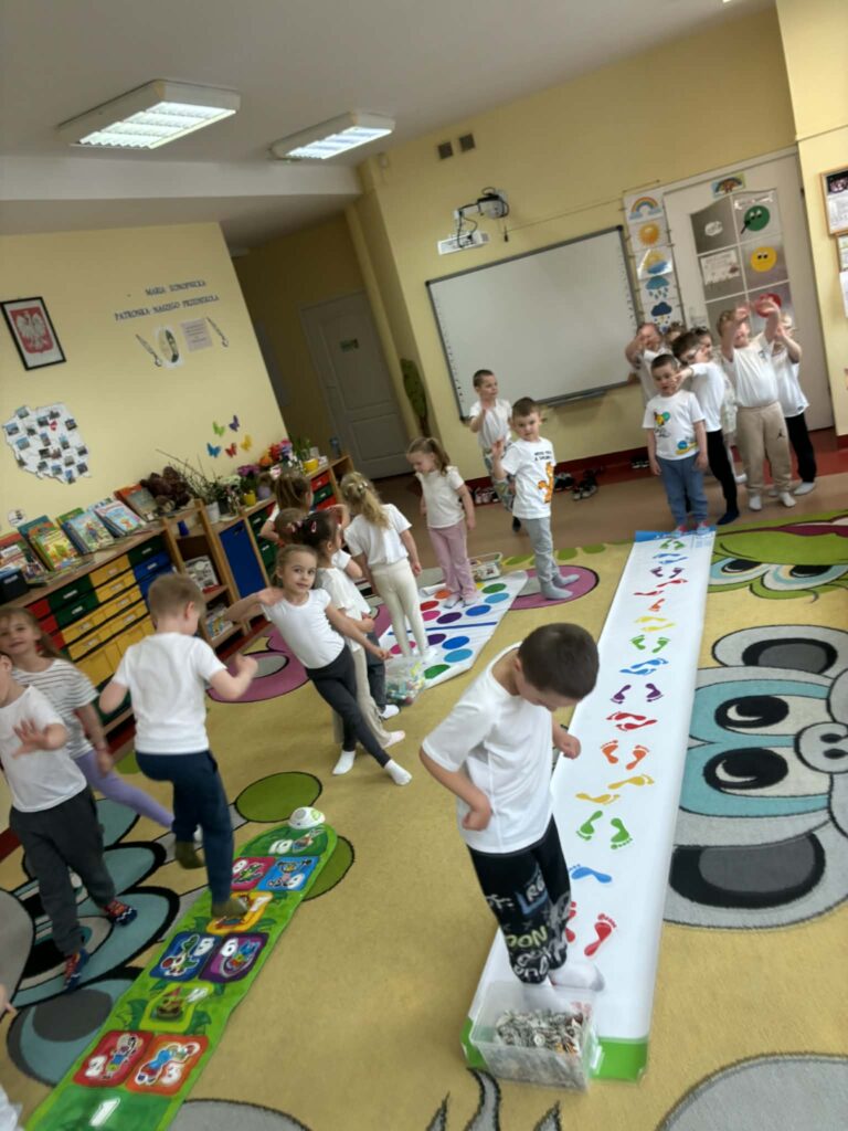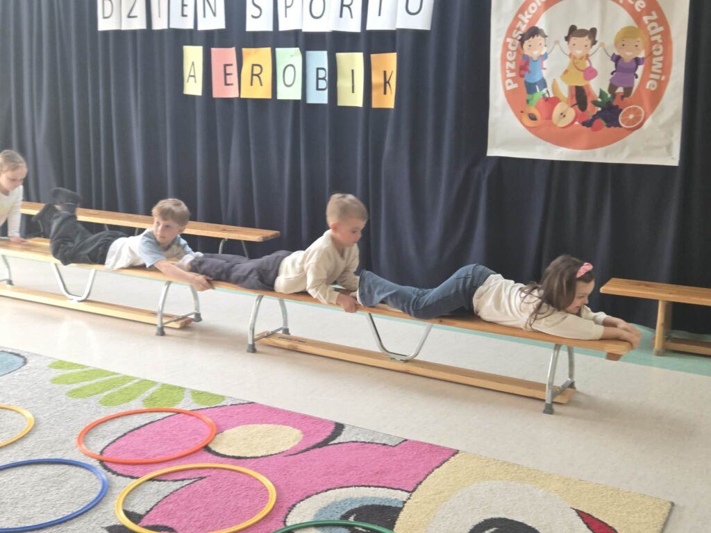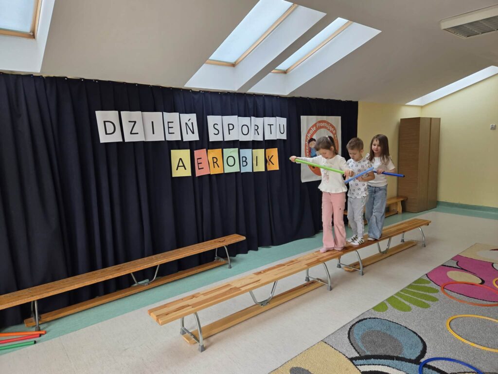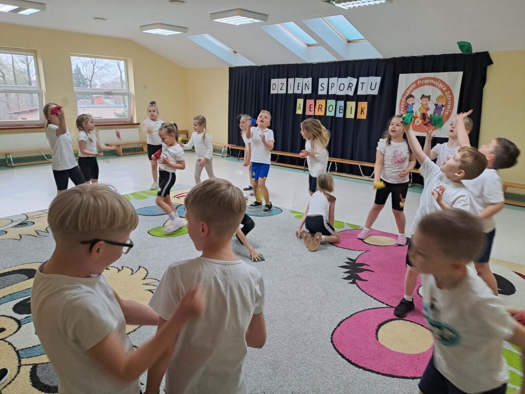 W ramach środowego Dnia sportu, realizowanego podczas Tygodnia Promocji Zdrowia w grupie „Krasnoludki”, „Żabki” i „Orzeszki”, dzieci brały udział w różnorodnych zajęciach gimnastycznych, ruchowych. W trakcie aktywności wykonywały ćwiczenia ogólnorozwojowe, brały udział w zabawach ruchowych oraz prostych konkurencjach sportowych dostosowanych do ich wieku.![]()
