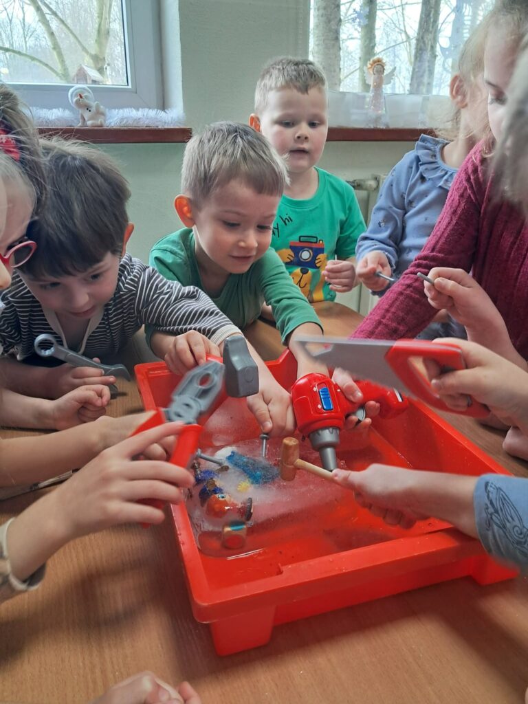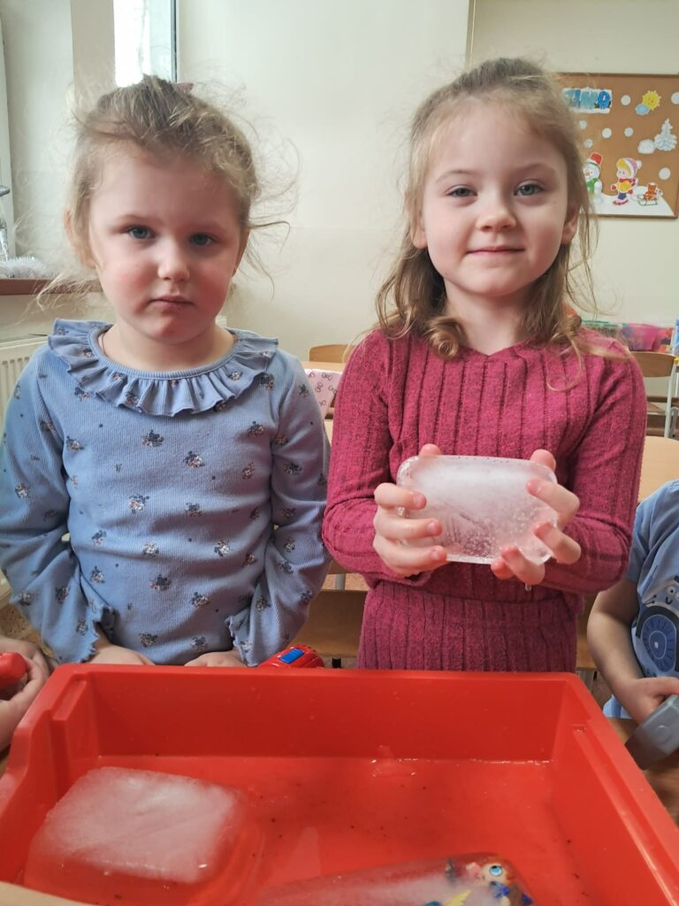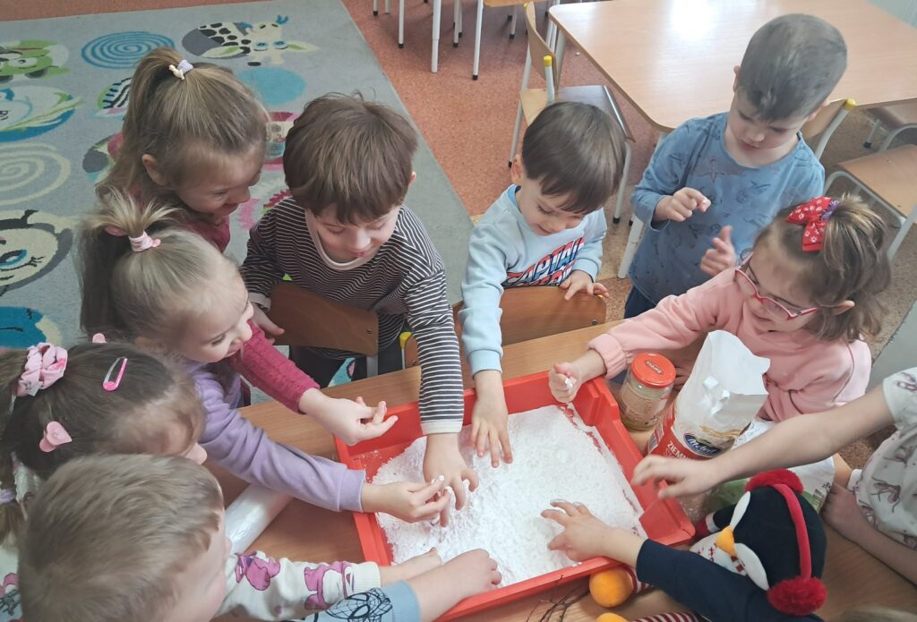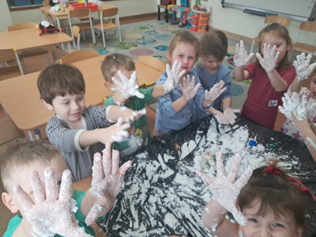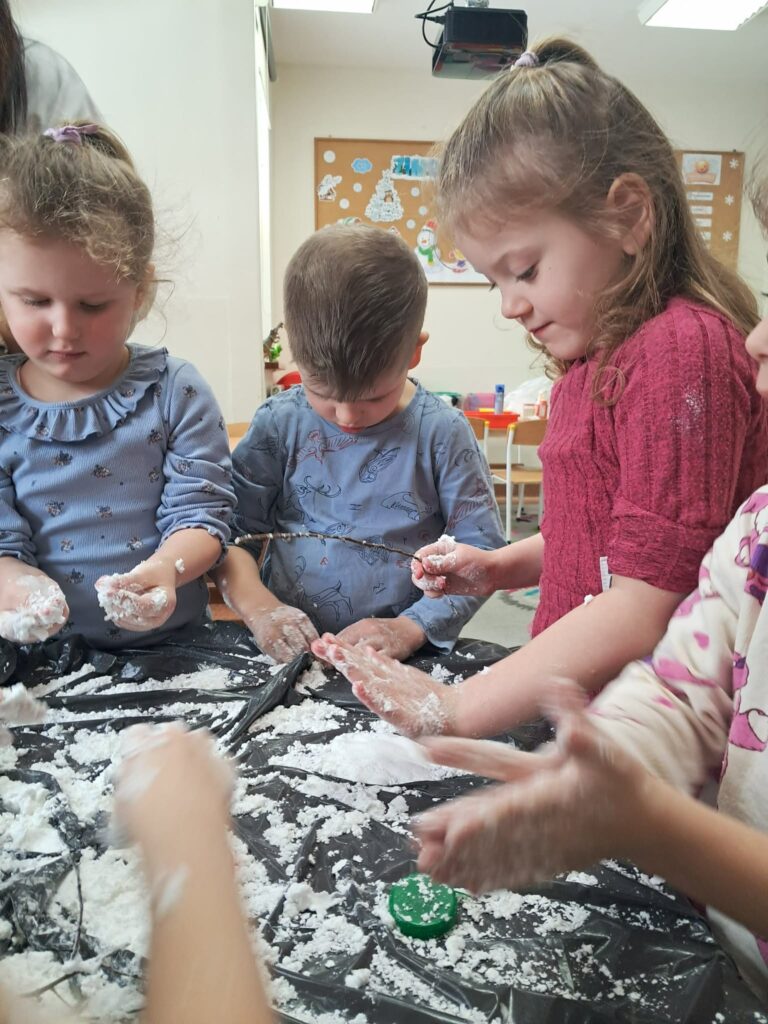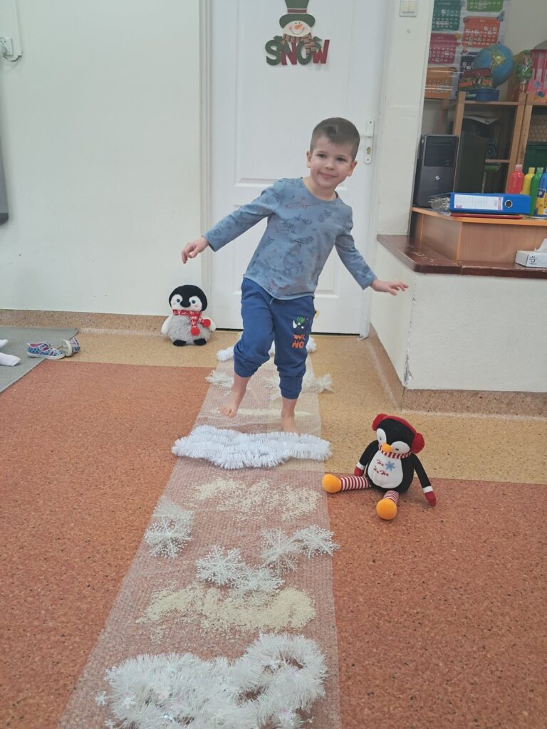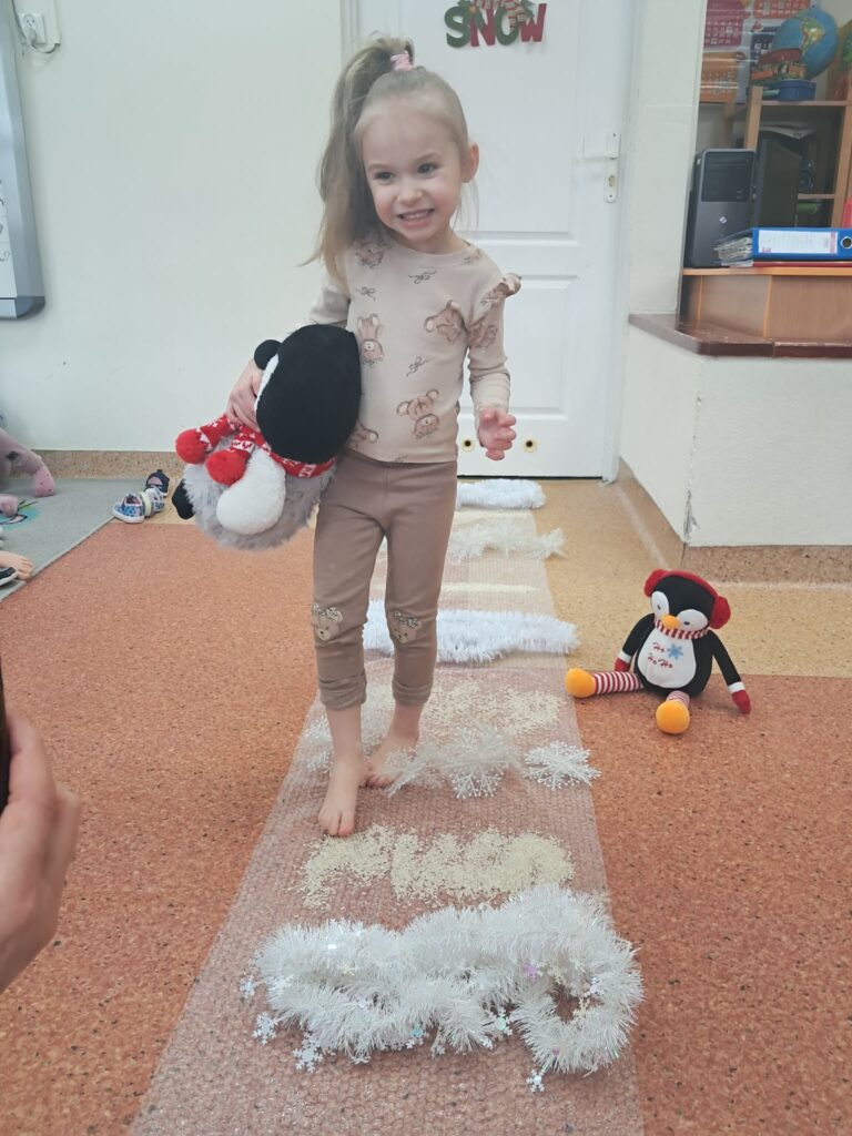 Celem zajęć było stymulowanie zmysłów, rozwijanie motoryki malej, koncentracji oraz koordynacji dzieci. Podczas zajęć dzieci: – wykonały sztuczny śnieg z mąki, pianki do golenia i płynu do naczyń, z którego ulepiły bałwanka; – malowały bryłki lodu obserwując zmiany pod wpływem temperatury; – wydobywały przedmioty z lodu przy pomocy różnych narzędzi i ciepłej wody; – chodziły po ścieżce sensorycznej wykonanej z folii bąbelkowej , piór ryżu opisując swoje wrażenia dotykowe.
